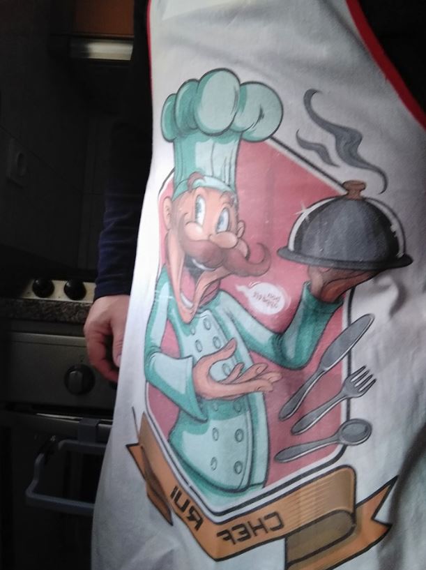 Avental branco com ilustração colorida de chef e texto CHEF RUI