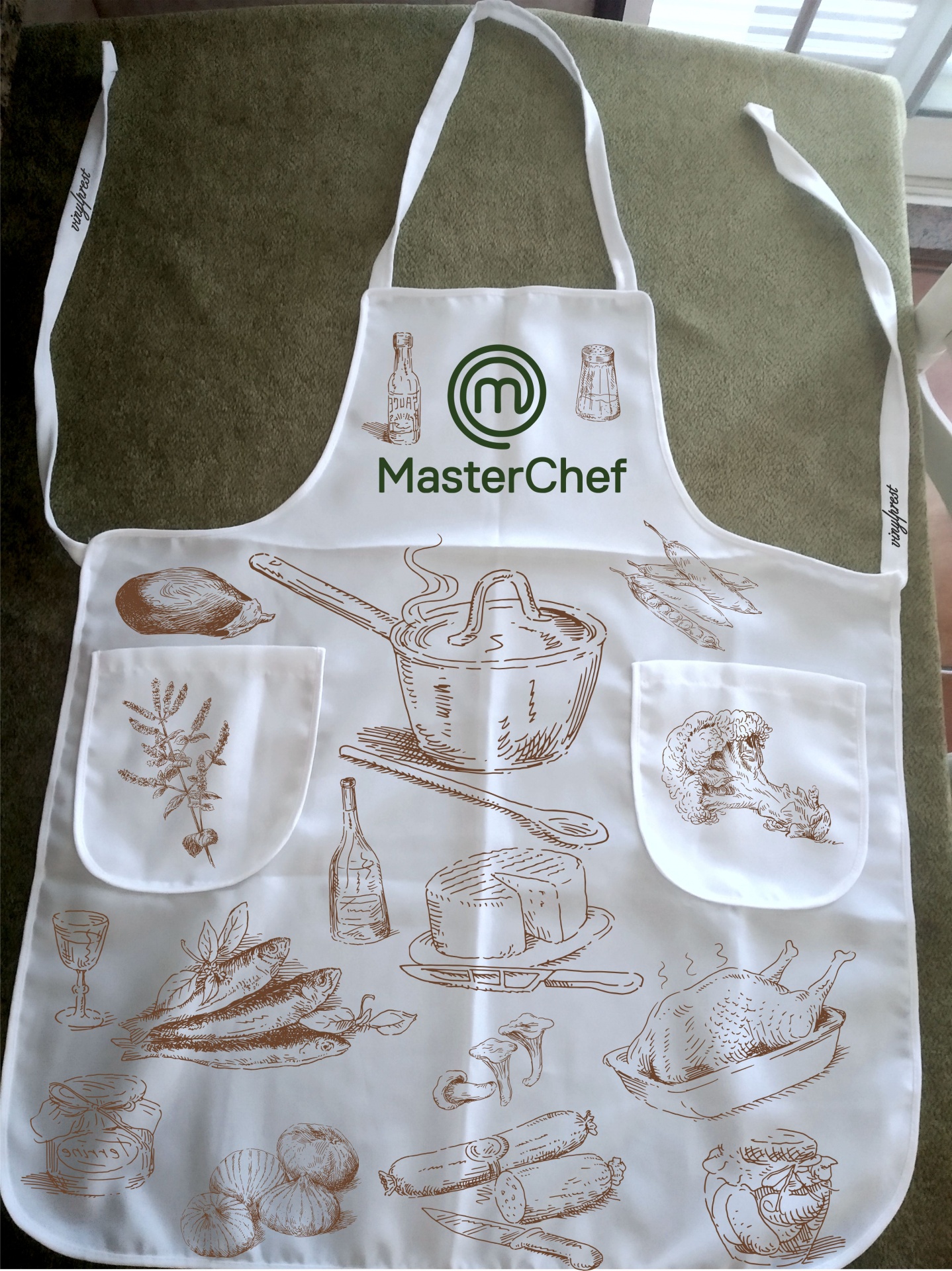Avental branco com ilustrações de comida e utensílios de cozinha e logotipo MasterChef