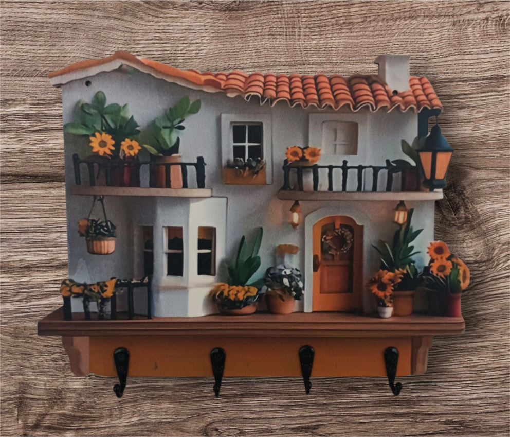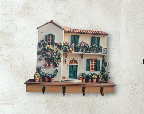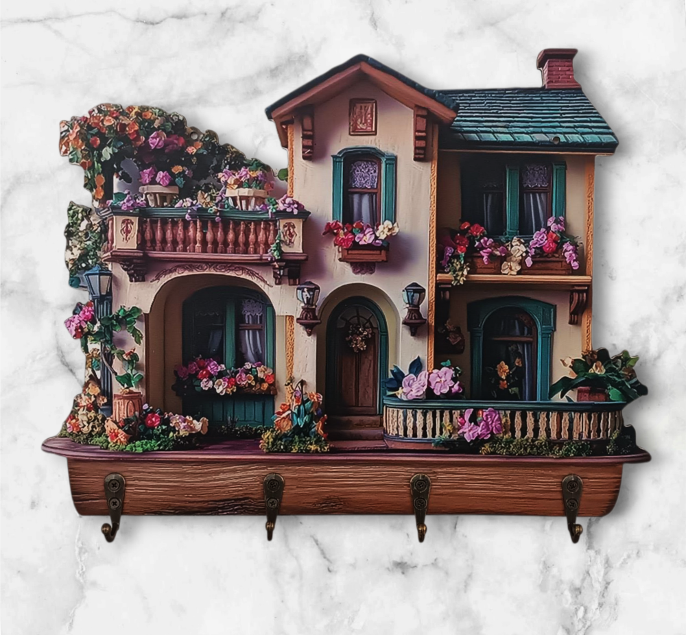 Cabide decorativo em forma de casa mediterrânica com flores e quatro ganchos metálicos
