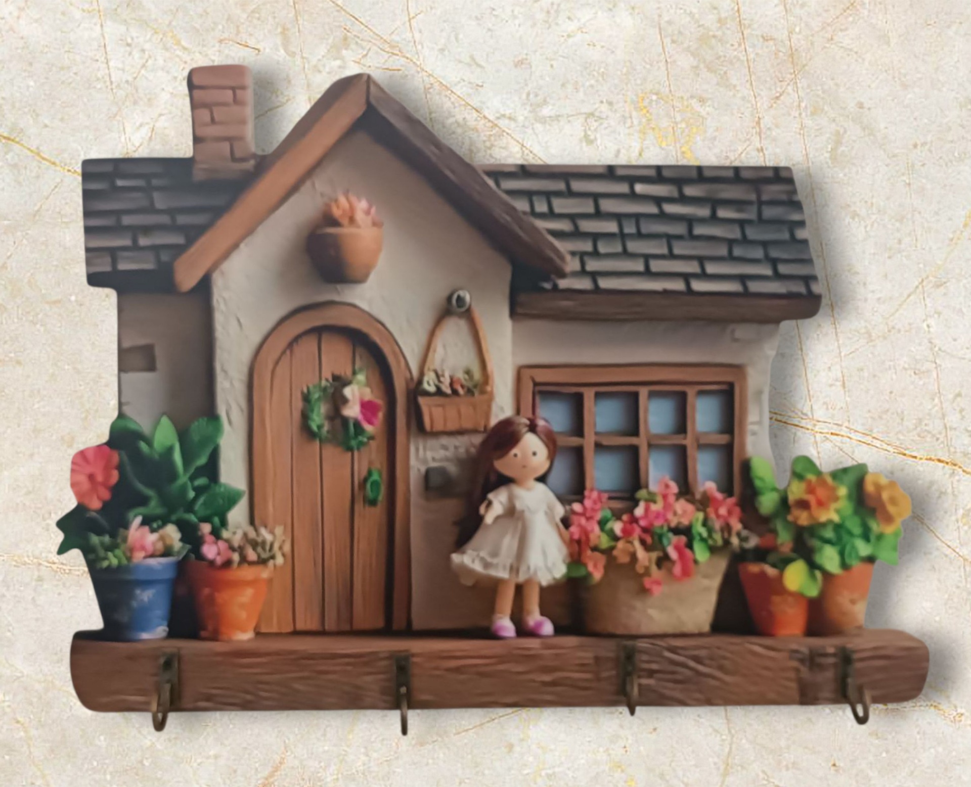 Cabide decorativo em forma de casa com boneca e vasos de flores